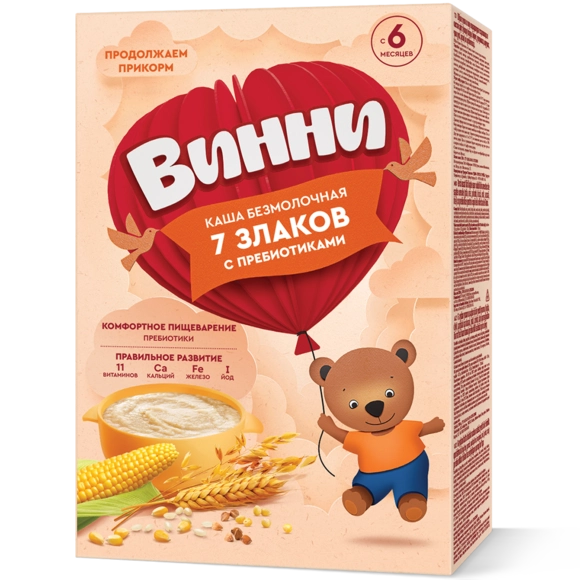 Ұн (бидай, күріш, жүгері, қарақұмық, сұлы, қарабидай, тары), қант, пребиотиктер (инулин), минералды заттар (кальций карбонаты, темір пирофосфаты, калий йодиді), дәрумендер (L-аскорбин қышқылы, никотинамид, D-альфа-токоферол ацетаты, кальций D-пантотенаты, рибофлавин, пиридоксин гидрохлориді, тиамин мононитраты, ретинол ацетаты, фолий қышқылы, D-биотин, цианкобаламин).