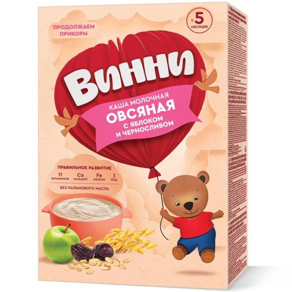 Сұлы ұны, қаймағы алынбаған құрғақ сүт, қант, алма үлпектері, қара өрік үлпектері, минералды заттар (кальций карбонаты, темір пирофосфаты, калий йодилі), дәрумендер (L-аскорбин қышқылы, никотинамид, D-альфа-токоферол ацетаты, кальций D-пантотенаты, рибофлавин, пиридоксин гидрохлориді, тиамин мононитраты, ретинол ацетаты, фолий қышқылы, D-биотин, цианкобаламин).