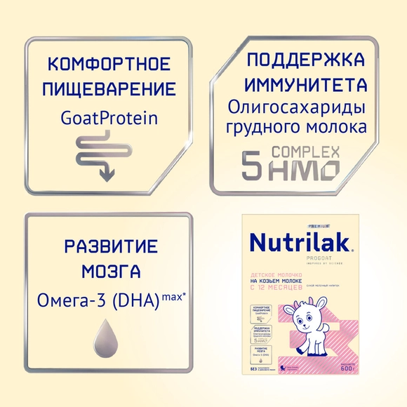 1 GoatProtein = ГоатПротеин * DHA max – халықаралық сарапшылардың ұсыныстарына сәйкес DHA қышқылының жоғары мөлшері (127/2016 ЕО директивасы)