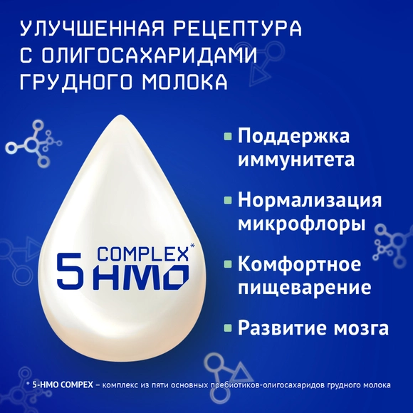 Құрамы: мальтодекстрин, сүт қант (лактоза), өсімдік майлары (күнбағыс жоғары олеинді, соя, кокос жаңғағы), ішінара гидролизденген сүт сарысуының ақуызы, сүт майы, жүгері крахмалы, галактоолигосахаридтер, эмульгаторлар (глицерин эфирі жəне лимон қышқылы жəне май қышқылдары, май қышқылдарының моно- және диглицеридтері) минералды заттар(кальций фосфаты, калий фосфаты, кальций карбонаты, магний хлориді, калий хлориді, натрий хлориді, темір (II) сульфаты, мырыш сульфаты, мыс сульфаты, марганец хлориді, калий йодиді, натрий селениті), балық майы (DHA докозагексаен қышқылының көзі), фруктоолигосахаридтер, дәрумендер(L-аскорбин қышқылы, DL-льфа-токоферол ацетаты, никотинамид, D-кальций пантотенаты, рибофлавин, ретинол ацетаты, пиридоксин гидрохлориді, тиамин гидрохлориді, фолий қышқылы, филлохинон, D-биотин, D3 холекальциферол, цианкобаламин), холин битартрататы, L. Rhamnosus (LGG®) лактобактерий концентраты, таурин, инозит, нуклеотидтер (цитидин-5'-монофосфор қышқылы, уридин-5'-динатрий тұзы монофосфаты, аденозин-5'-монофосфор қышқылы, гуанозин-5'-динатрий тұзы монофосфаты, инозин-5'-динатрий тұзы монофосфаты), L-карнитин, қышқылға қарсы (l-аскорбилпальмитат). ГМО жоқ!